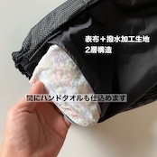 ◯上部綿生地の裏には撥水加工生地が挟んであります。ハンドタオル、フェイスタオルなどを挟めますので過剰な汗、ヨダレ対策に